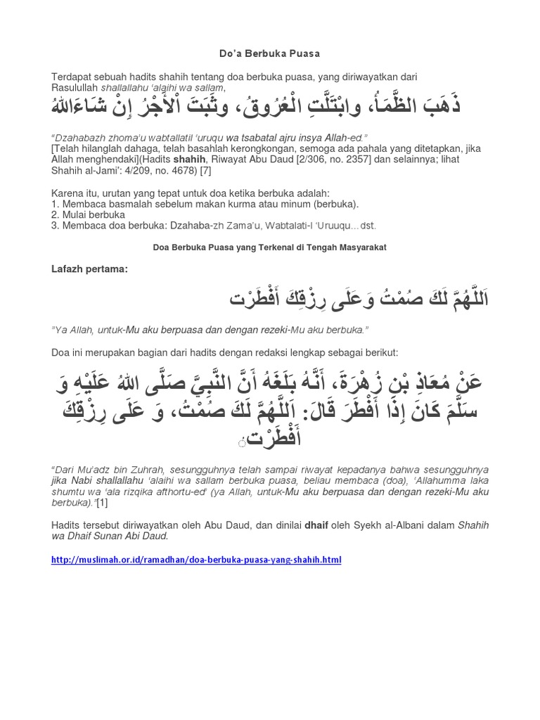 Seperti yang dicontohkan rasulullah saw, mulai membaca. Sesuai anjuran islam, berbukalah dengan yang manis. Artikel ini menuliskan doa berbuka puasa dalam bahasa arab dan tulisan rumi. Membaca doa buka puasa tidak masuk dalam rukun atau syarat sah puasa. Telah hilang rasa haus, telah basah kerongkongan, dan telah diraih pahala insyaallah. Karena pada waktu tersebut seseorang dan pada kesempatan ini kita akan membahas hadits tentang doa berbuka puasa dengan dua versinya yang telah banyak di kenal di masyarakat kita. Dengan rahmatmu wahai yang maha pengasih dan penyayang. (hr bukhari dan muslim). Derajat hadits doa berbuka puasa allahumma laka. Doa berbuka puasa yang benar dan shahih. Beberapa faktor yang membolehkan seorang muslim tidak berpuasa di antaranya yakni karena sakit, haid, nifas. Karena itu, muslim dianjurkan banyak memanjatkan doa saat berbuka puasa senin kamis. Waktu berbuka puasa ramadhan adalah ketika siang telah berlalu dan matahari telah terbenam dan malam mulai datang. Doa berbuka puasamembaca doa sebelum berbuka puasa merupakan salah satu hal yang dianjurkan oleh rasulullah saw.